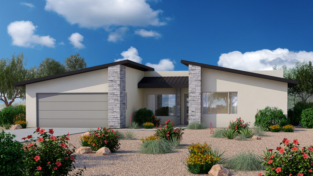 A statement entry door welcomes you into a home with a thoughtful floor plan that flaunts a stunning kitchen, luxurious bathrooms, high ceilings, glass sliders, elegant tile flooring, and energy-efficient design and appliance choices. Each home promises true comfort and style, from the granite slab countertops to the bathroom fixtures. The architectural design ensures gorgeous desert views to greet you every morning.