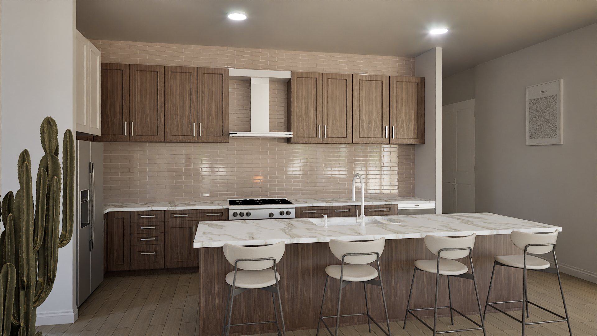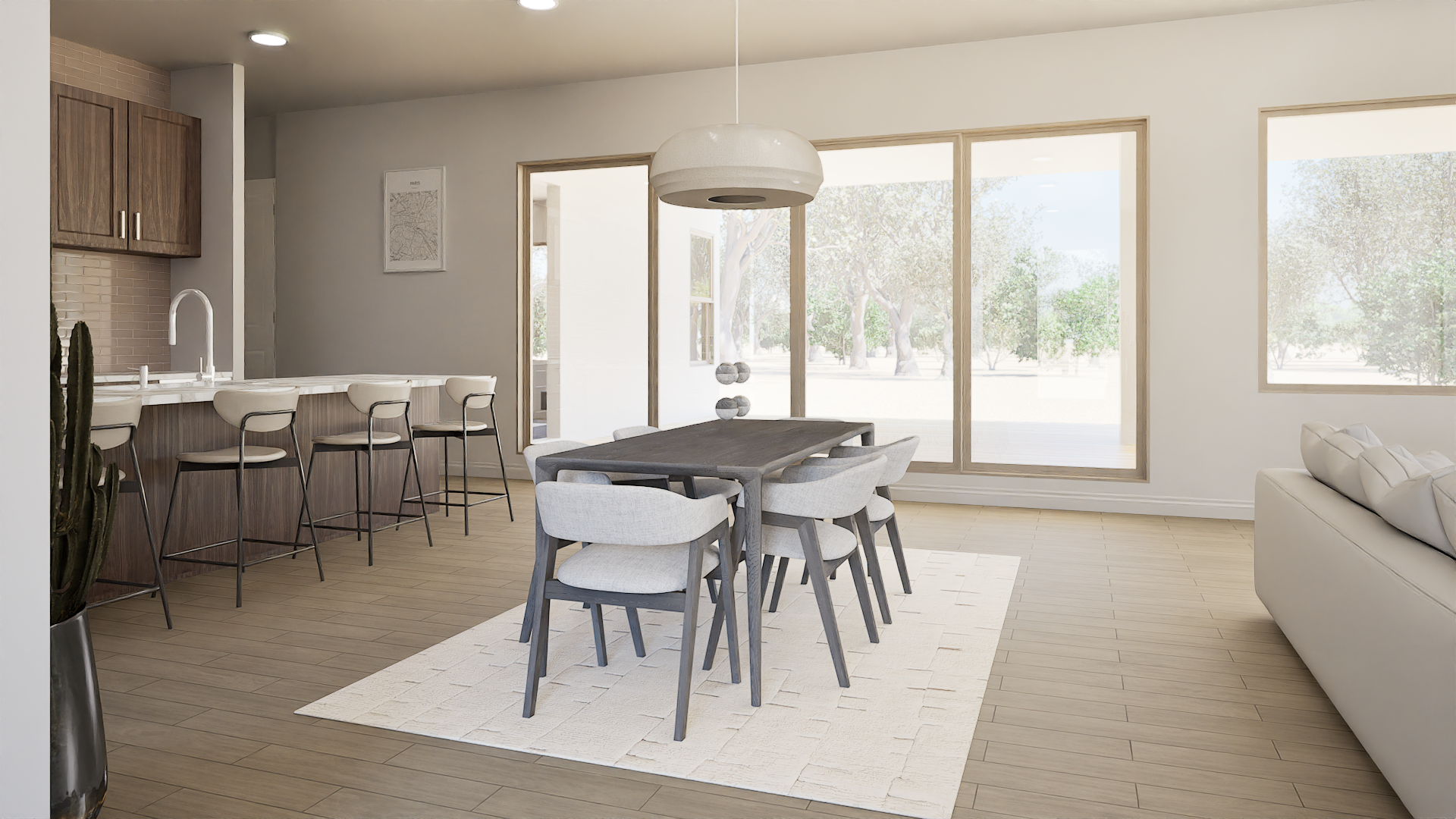 A statement entry door welcomes you into a home with a thoughtful floor plan that flaunts a stunning kitchen, luxurious bathrooms, high ceilings, glass sliders, elegant tile flooring, and energy-efficient design and appliance choices. Each home promises true comfort and style, from the granite slab countertops to the bathroom fixtures. The architectural design ensures gorgeous desert views to greet you every morning.