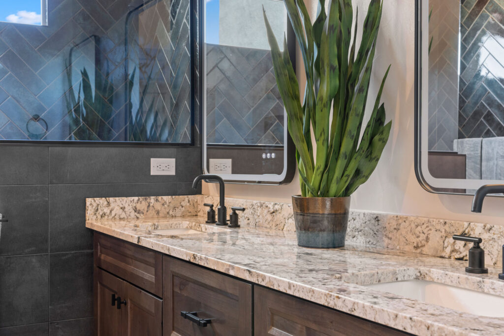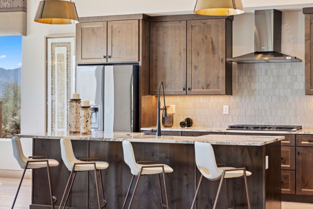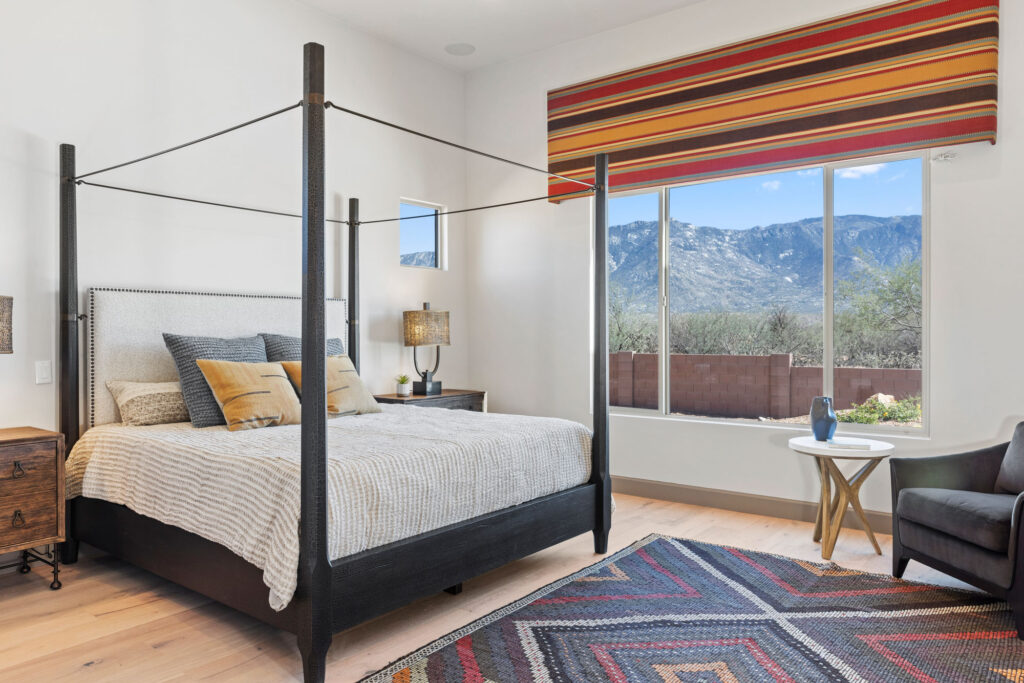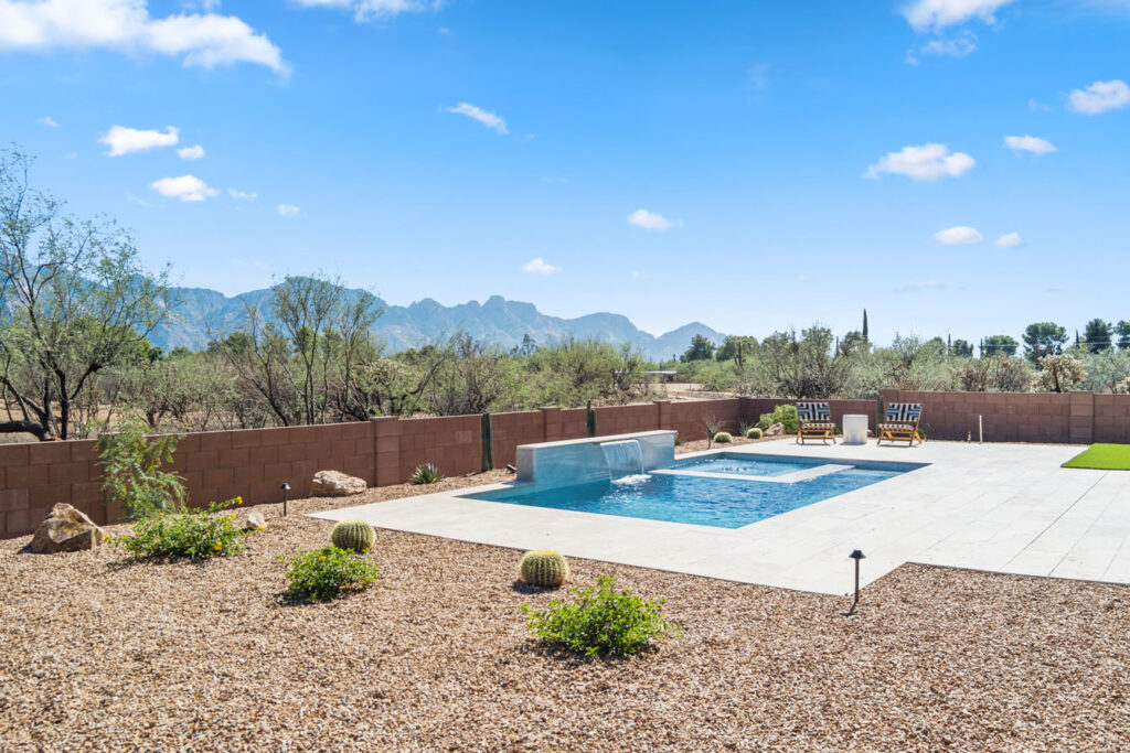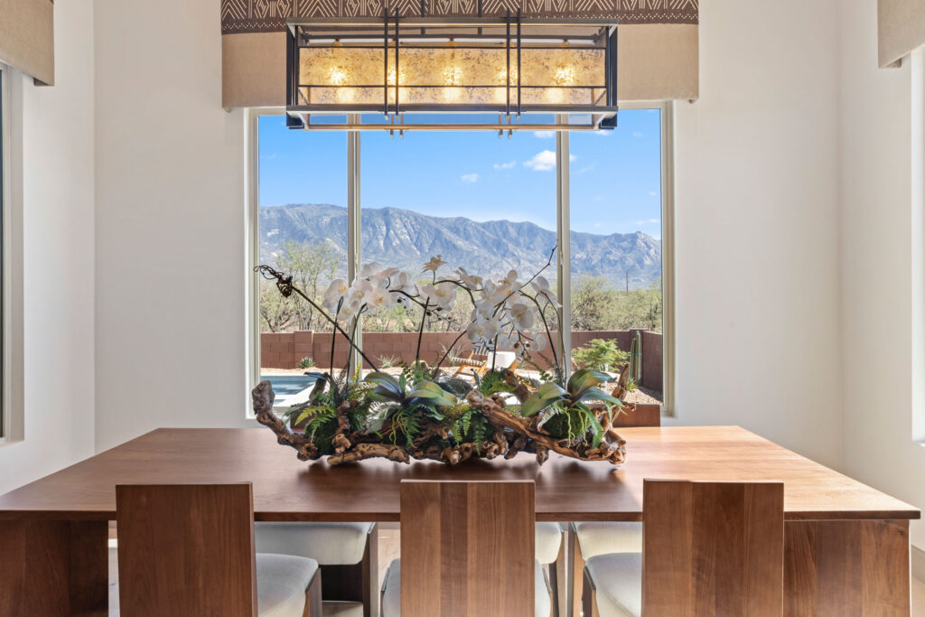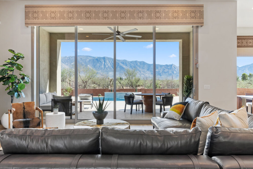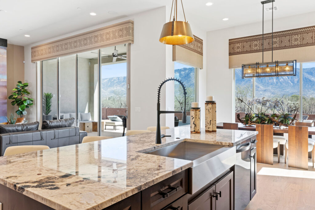 The gourmet kitchen is a chef’s dream, featuring soft-close cabinetry and premium finishes. Expansive picture windows and a wide glass slider frame panoramic views of the Catalina Mountains, seamlessly blending the indoor and outdoor living experience. Every element of this home invites tranquility, elegance, and connection to the stunning Sonoran landscape.