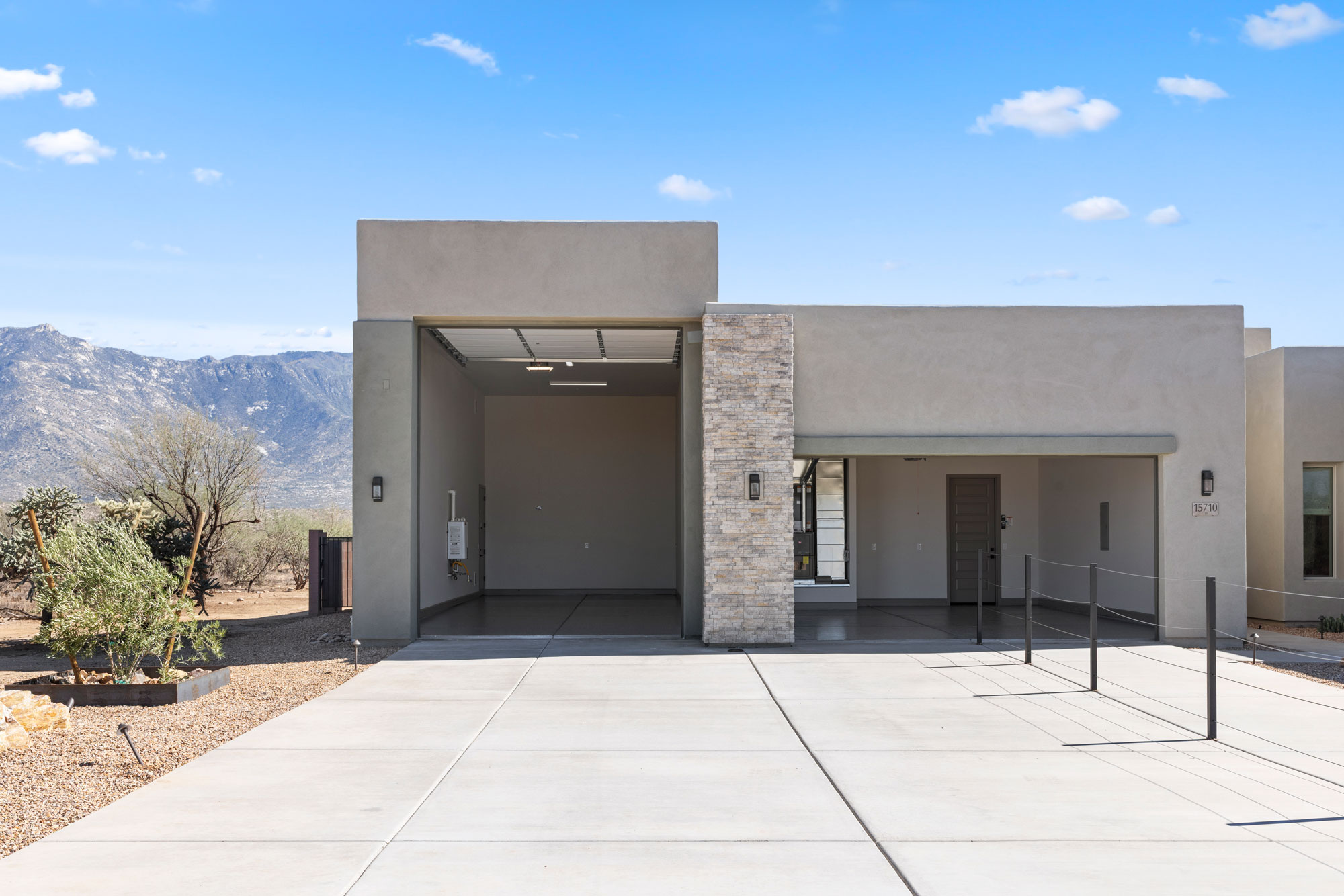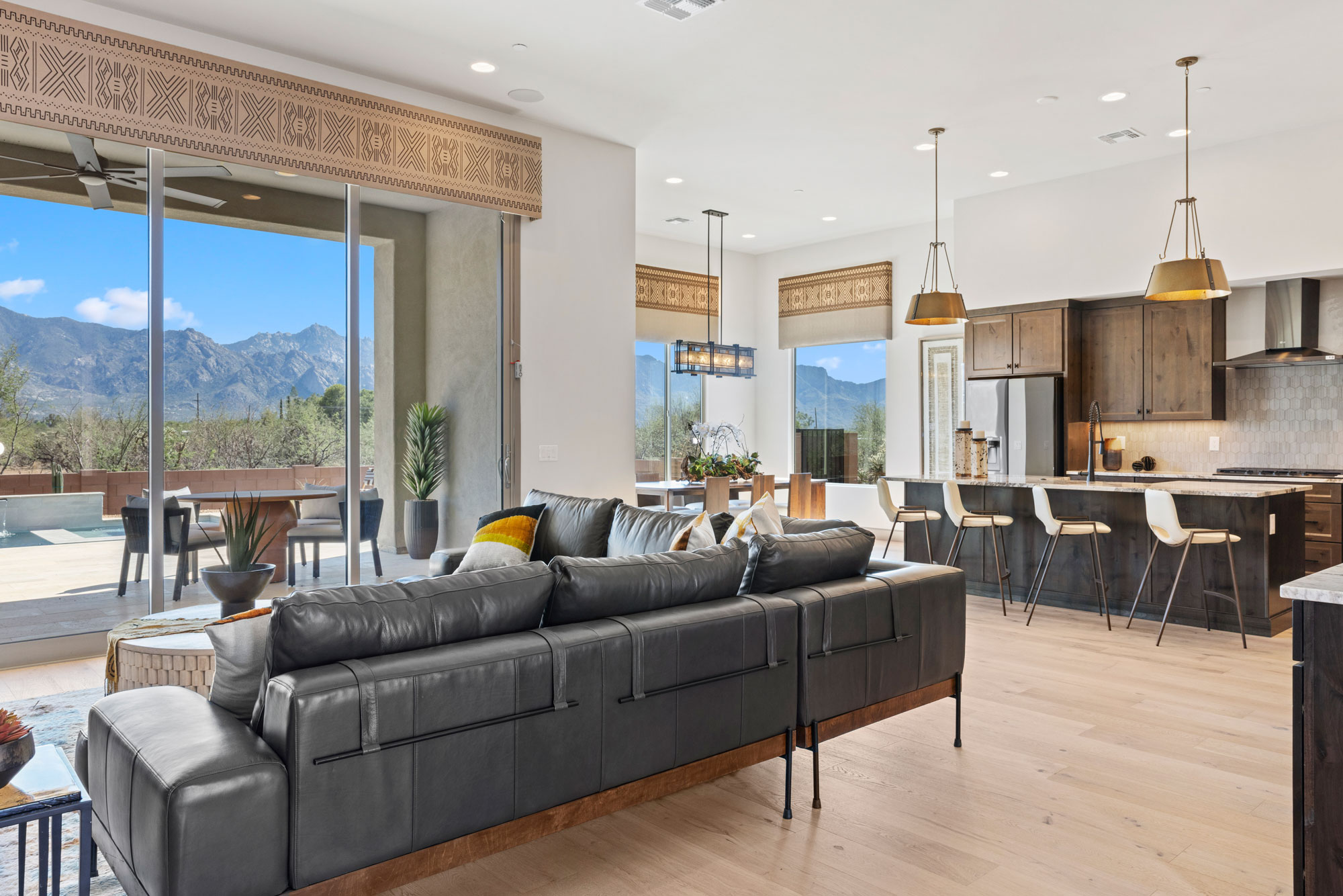 The gourmet kitchen is a chef’s dream, featuring soft-close cabinetry and premium finishes. Expansive picture windows and a wide glass slider frame panoramic views of the Catalina Mountains, seamlessly blending the indoor and outdoor living experience. Every element of this home invites tranquility, elegance, and connection to the stunning Sonoran landscape.