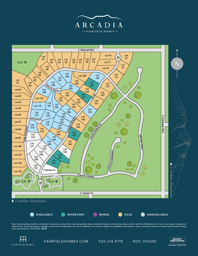 Imagine your new, customized home with the backdrop of the grand Catalina Mountains at summer sunset or the snow-covered peaks on a winter sunrise. Located 12 miles north of Tucson, Arcadia is a quiet gated neighborhood set minutes away from grocery, medical centers, entertainment, and shopping within the beautiful Catalina Foothills.