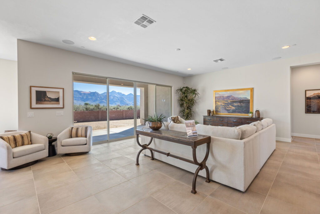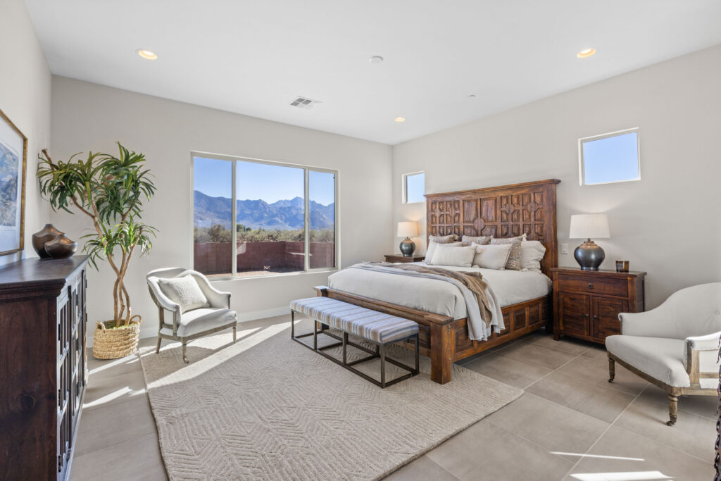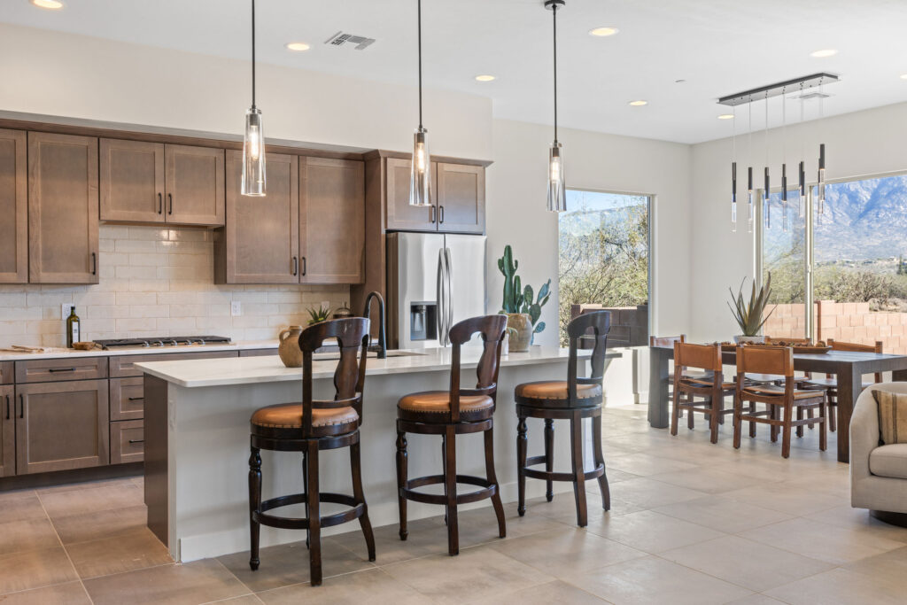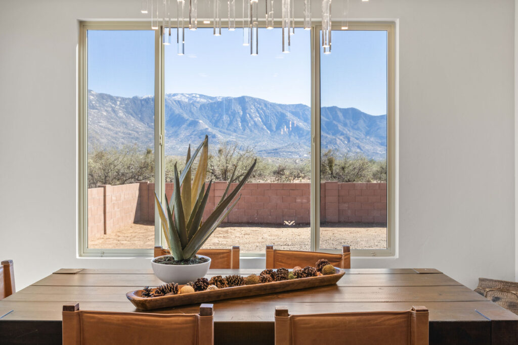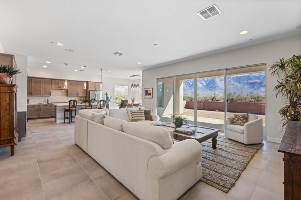 The gourmet kitchen is a chef’s dream, featuring soft-close cabinetry and premium finishes. Expansive picture windows and a wide glass slider frame panoramic views of the Catalina Mountains, seamlessly blending the indoor and outdoor living experience. Every element of this home invites tranquility, elegance, and connection to the stunning Sonoran landscape.