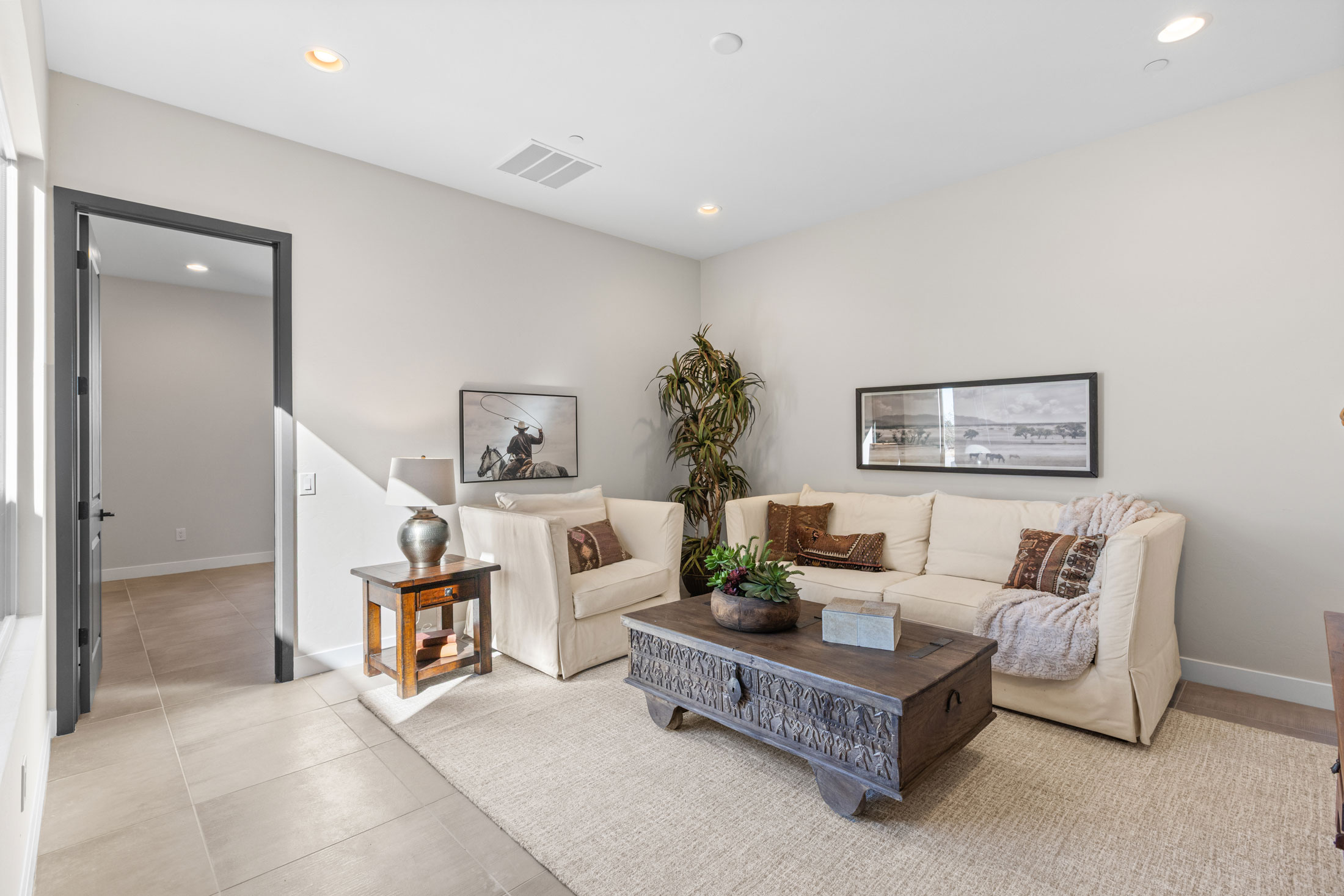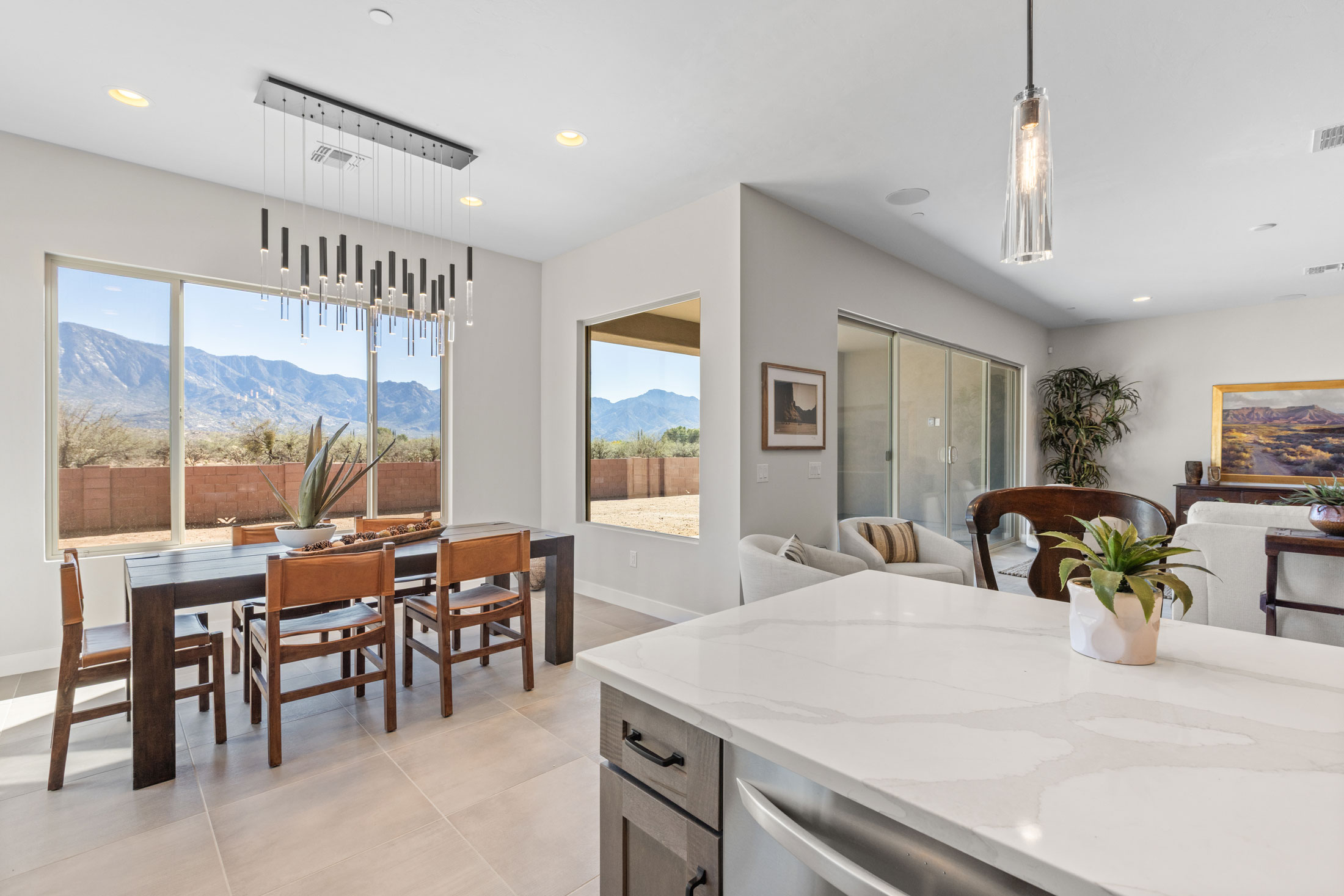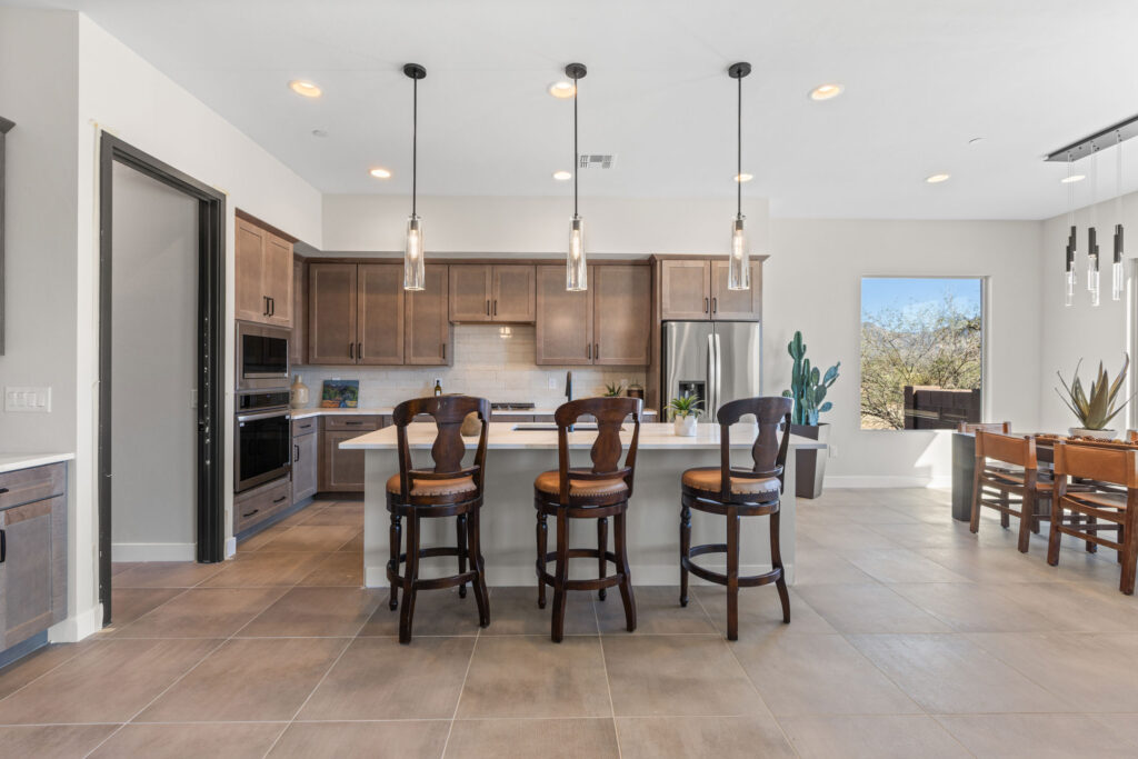 The gourmet kitchen is a chef’s dream, featuring soft-close cabinetry and premium finishes. Expansive picture windows and a wide glass slider frame panoramic views of the Catalina Mountains, seamlessly blending the indoor and outdoor living experience. Every element of this home invites tranquility, elegance, and connection to the stunning Sonoran landscape.