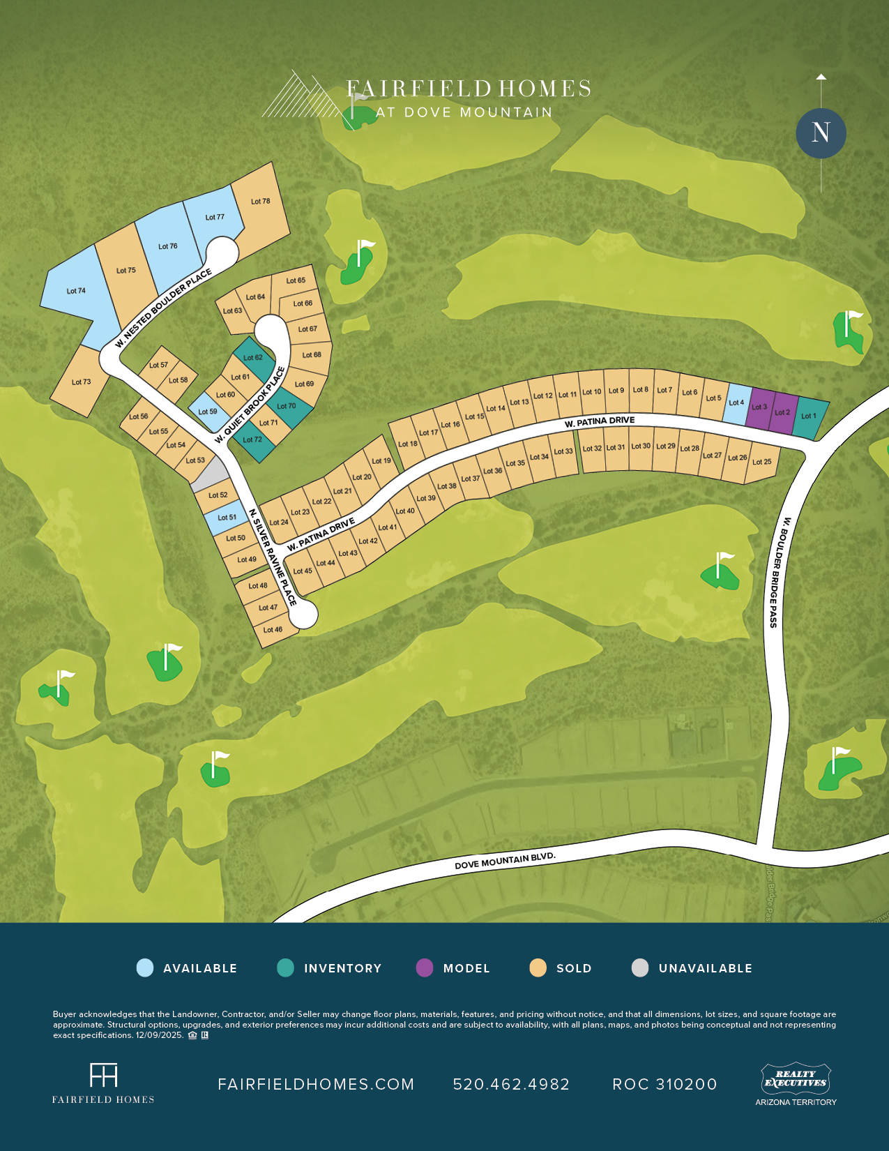 Within driving distance of downtown Tucson and beautiful nature preserves and parks, Fairfield Homes at Dove Mountain boasts access to the best of all worlds for individuals who love both life’s comforts and natures’ beauty. Enjoy Dove Mountain golf courses, tennis courts, the Luxury Ritz-Carlton Hotel, and other activities. Spend the day exploring nearby Catalina State Park, Saguaro National Park, or Wild Burro Trailhead which is the gateway into the Tortolita Mountains featuring beautiful wildflowers, stunning wildlife, and quality views.