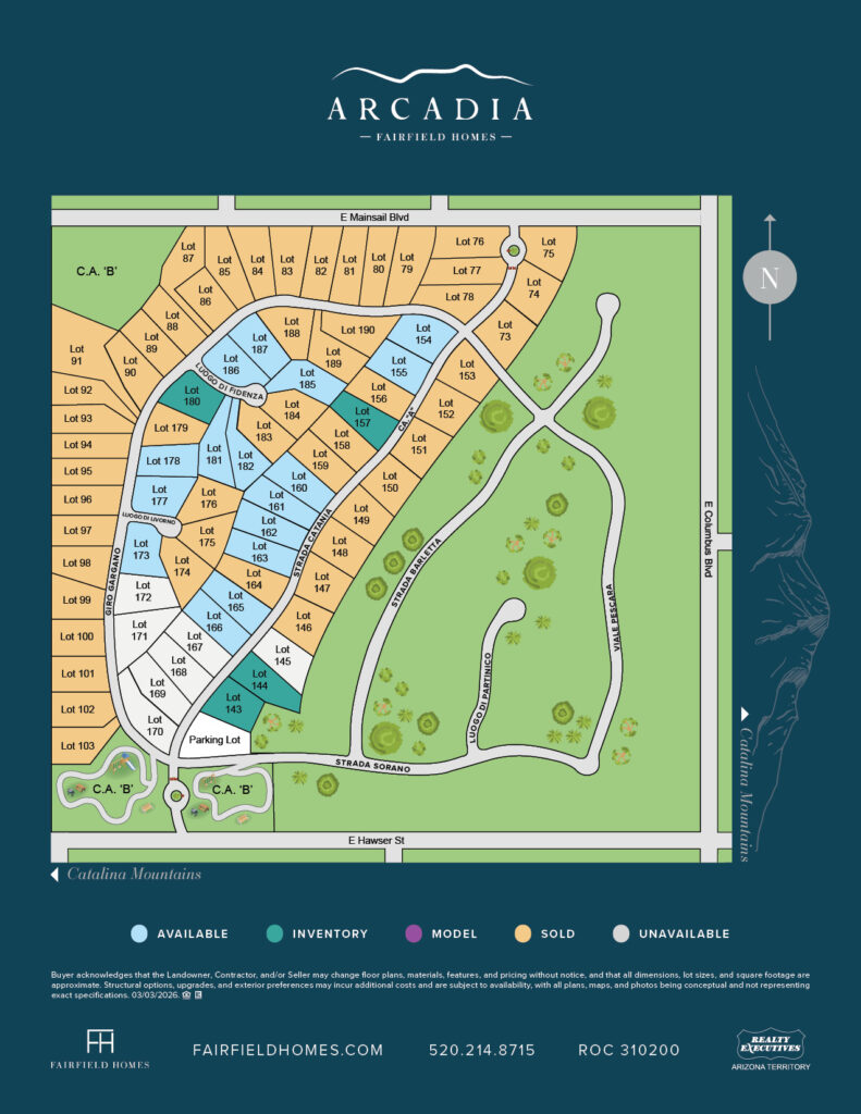 Imagine your new, customized home with the backdrop of the grand Catalina Mountains at summer sunset or the snow-covered peaks on a winter sunrise. Located 12 miles north of Tucson, Arcadia is a quiet gated neighborhood set minutes away from grocery, medical centers, entertainment, and shopping within the beautiful Catalina Foothills.