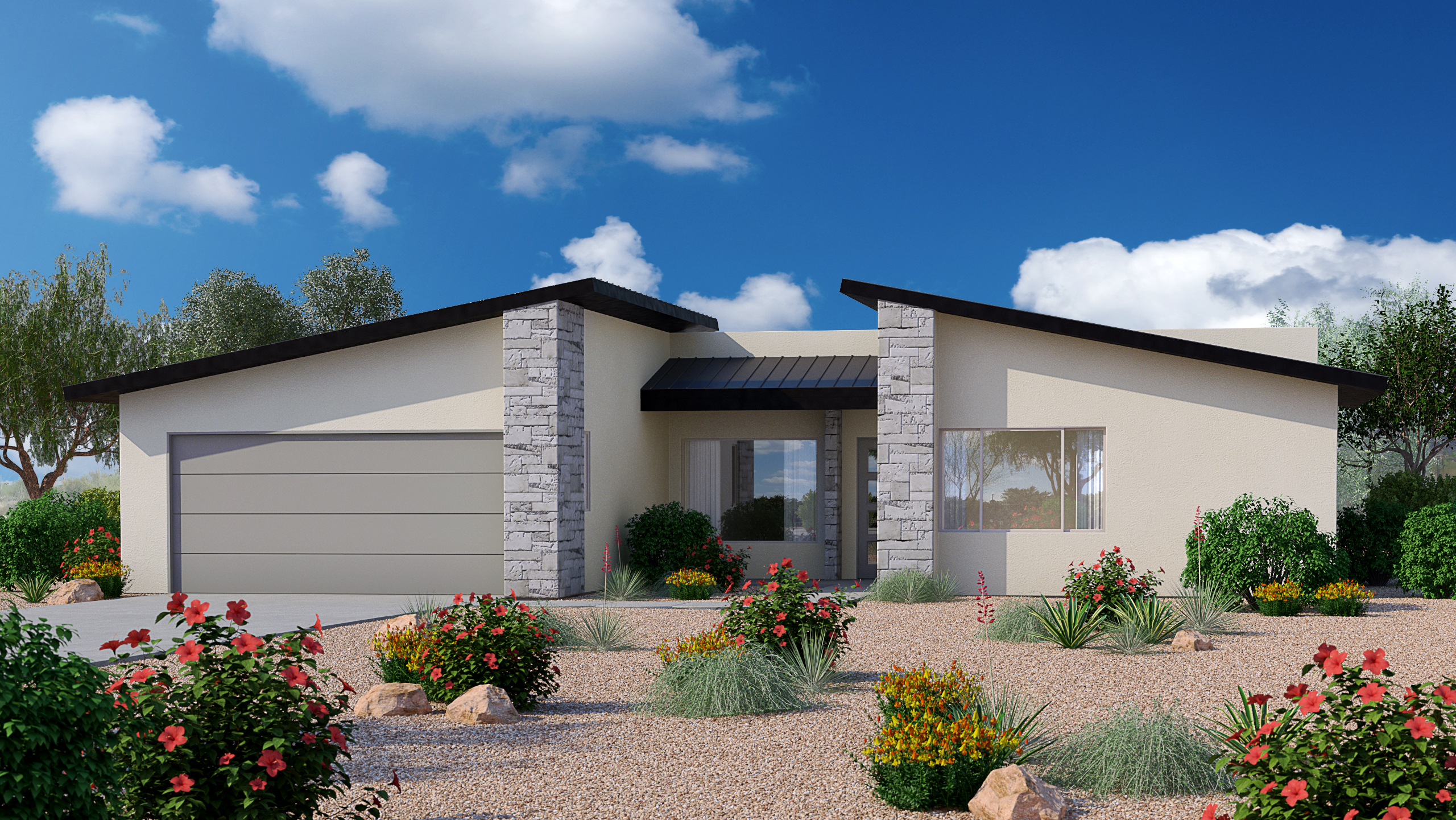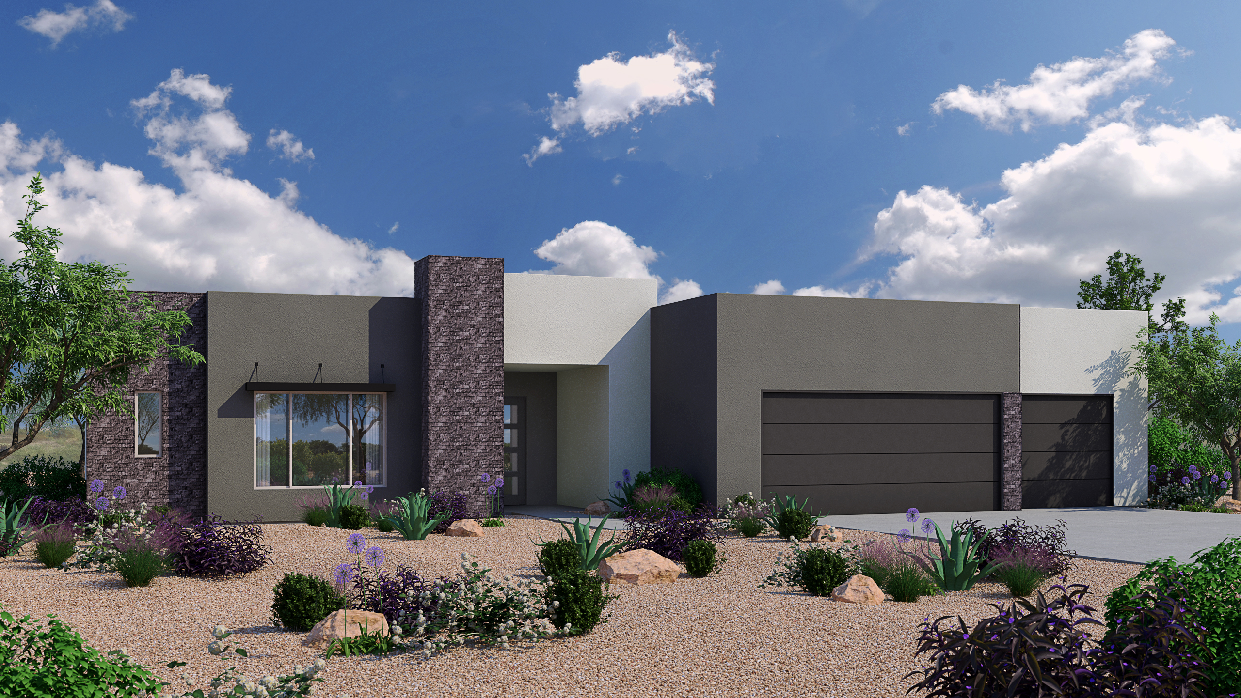 A statement entry door welcomes you into a home with a thoughtful floor plan that flaunts a stunning kitchen, luxurious bathrooms, high ceilings, glass sliders, elegant tile flooring, and energy-efficient design and appliance choices. Each home promises true comfort and style, from the granite slab countertops to the bathroom fixtures. The architectural design ensures gorgeous desert views to greet you every morning.