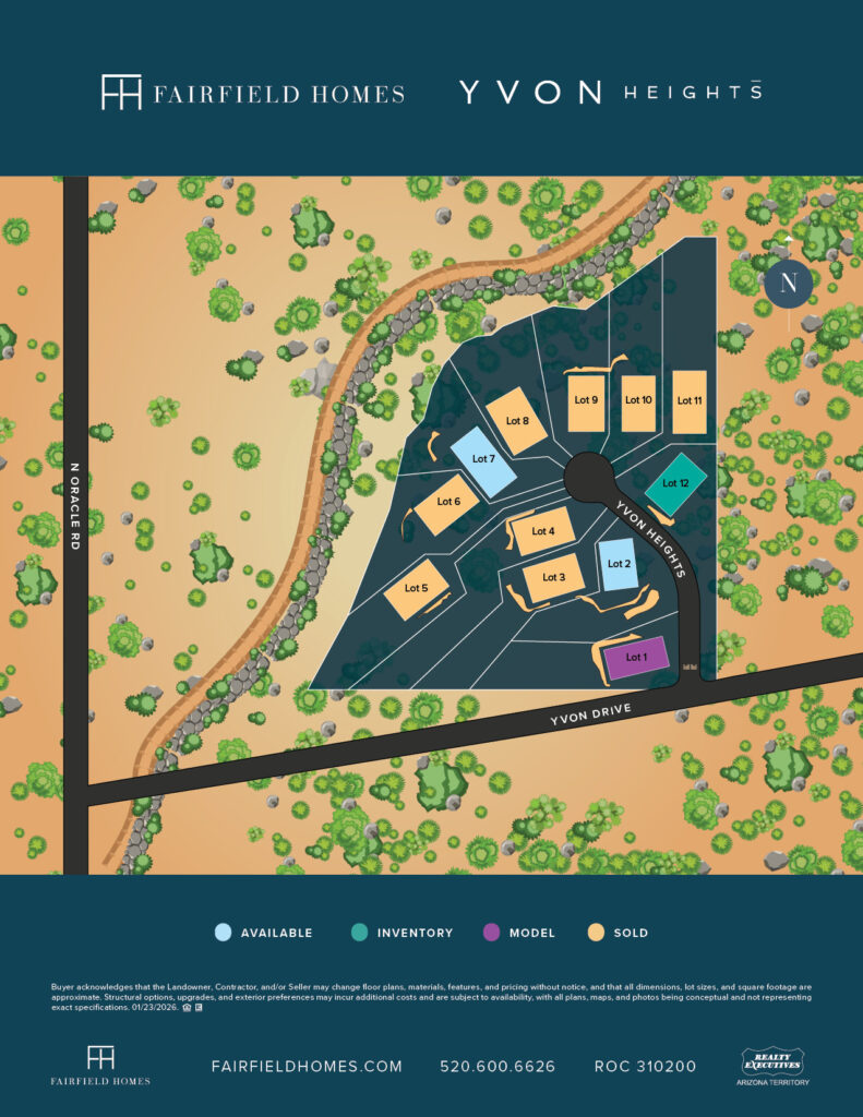 A snug gated community adorned by lush flora natural to Tucson and nestled into the Catalina Foothills, Yvon Heights presents the pinnacle of foothills living. East of Oracle Road and north of River Road, Yvon Heights rests high on the ridge boasting panoramic views, magnificent city lights, and breathtaking Catalina mountain views. One-acre homesites are rare due to Yvon Heights’ close proximity to the city’s many amenities and tucked away privacy for an all-encompassing coziness.